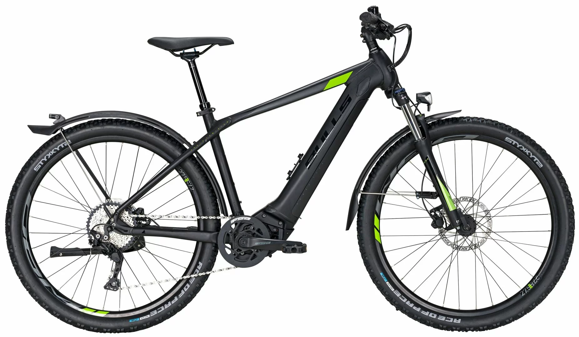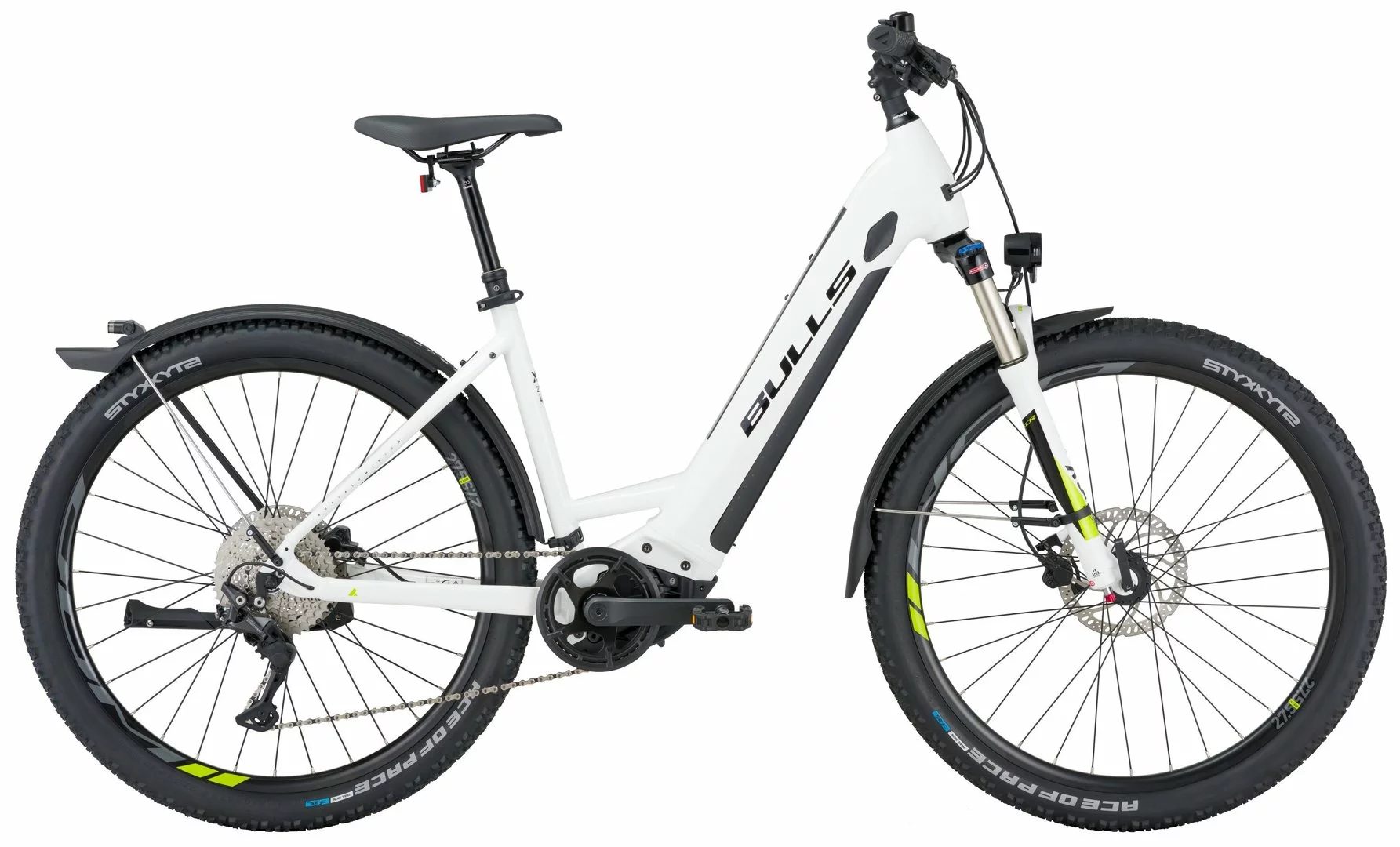 6061 Alu-Rahmen, XCR-Air-HLO Federgabel, Deore 10-Gang Schaltwerk und Schalthebel, Tektro HD-M275 Scheibenbremsen mit 180mm Bremsscheiben, DDM-2 Disc Hohlkammerfelgen, Bosch Performance-CX Mittelmotor 85Nm, 400Wh (Standard), 500Wh oder 625Wh (Aufpreis) Akku 36V Li-Ion, absenkbare Limotec Sattelstütze, STYX Ace of Pace 27½ x 2,25 Reifen, Fuxon FS70 LED-Lampe mit 70 Lux, 12 Volt Lichtanlage, SKS Velo 65 Schutzbleche mit integr. Rücklicht, Ständer