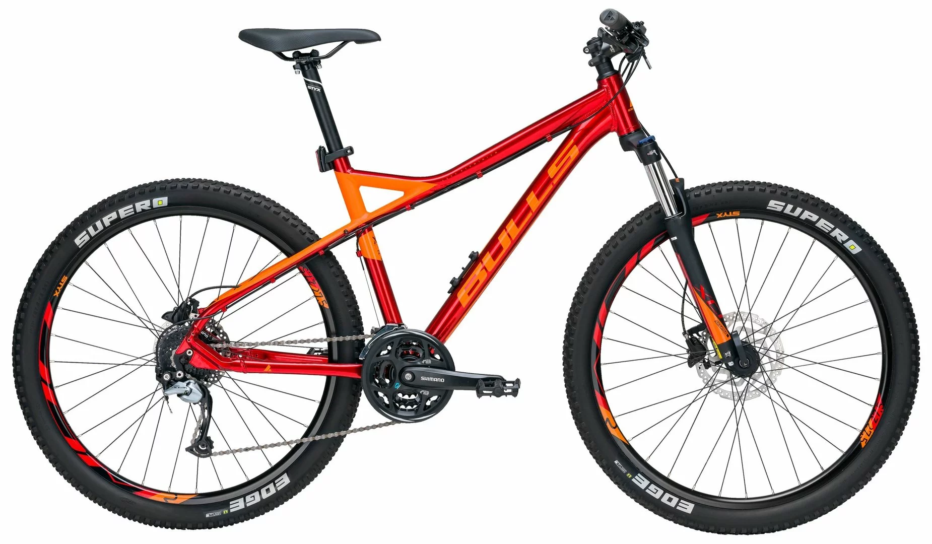 7005 Alu Rahmen, Suntour XCM Federgabel mit hydr. Lockout, 24-Gang Acera Schaltwerk, Altus Schalthebel, Umwerfer und Tretlager, Formula Naben, Shimano MT-201 Disc-Bremsen 160/180mm, STYX DDM-2 Disc Felgen, Supero Edge Reifen, STYX Lenker, Vorbau und Sattelstütze, Monkey-Link Halter vormontiert