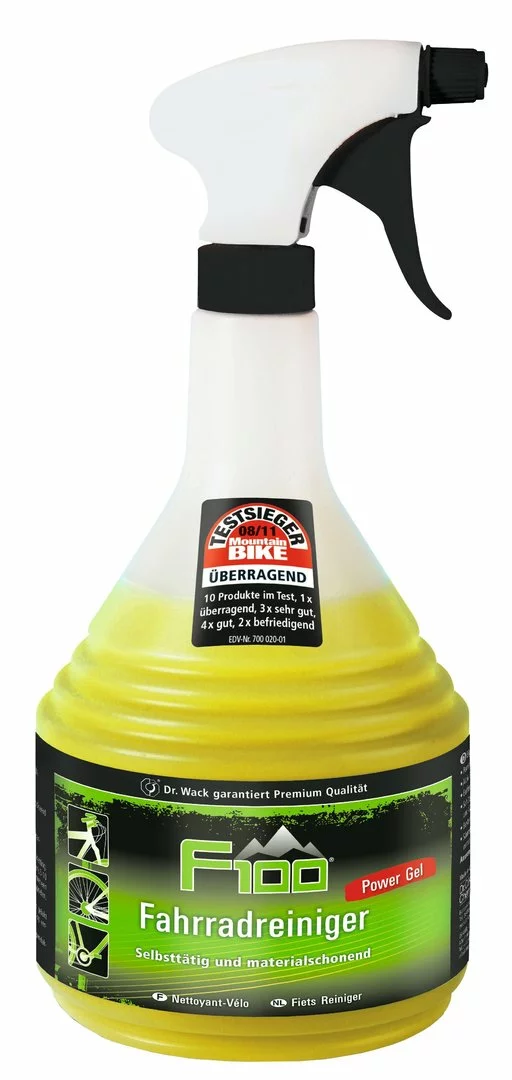 - Der F100 Fahrradreiniger entfernt mit seiner speziellen Aktiv-Fettlöseformel selbst härteste Verschmutzungen (z.B. abgeschleudertes Kettenöl) selbsttätig und hinterlässt keine Rückstände.