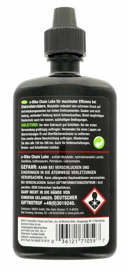 Der Antriebsstrang von E-Bikes wird im Vergleich zu herkömmlichen Fahrrädern erheblich stärker belastet. Für diese erhöhten Anforderungen hat Finish Line dieses spezielle E-Bike Kettenöl entwickelt. Unter Verwendung neuester Schmiermitteltechnologie und Beachtung der von E-Bikeherstellern geforderten Spezifikationen hat Finish Line ein einzigartiges Schmiermittel für die optimale Perfomance aller E-Bikes entwickelt. Die Rezeptur des Finish Line E-Bike Kettenöls wurde originär auf die Schmierung elektrisch unterstützter Antriebe mit systembedingt hohem Betriebsdruck und Drehmoment abgestimmt. Die meisten Mittelmotorsysteme liefern durchschnittlich 250 Watt zusätzlich zur Pedalkraft des Fahrers, bei einigen Modellen sind es sogar 350 Watt. Diese permanent hohe Belastung verschleißt Ketten spürbar schneller. Das Entwicklungsziel für unser E-Bike Kettenöl war ein Schmiermittel, das nicht nur den hohen Drehmomentwerten standhält, sondern gleichzeitig lange Schmierintervalle gewährleistet, Verschmutzung reduziert, Verschleiß minimiert und optimalen Korrosionsschutz bietet. Mit seiner semi-trockenen Konsistenz in Verbindung mit unserer proprietäre Mixtur aus hochdruckstabilen und korrosionsverhindernden Additiven erfüllt das Finish Line E-Bike Kettenöl alle genannten Anforderungen.