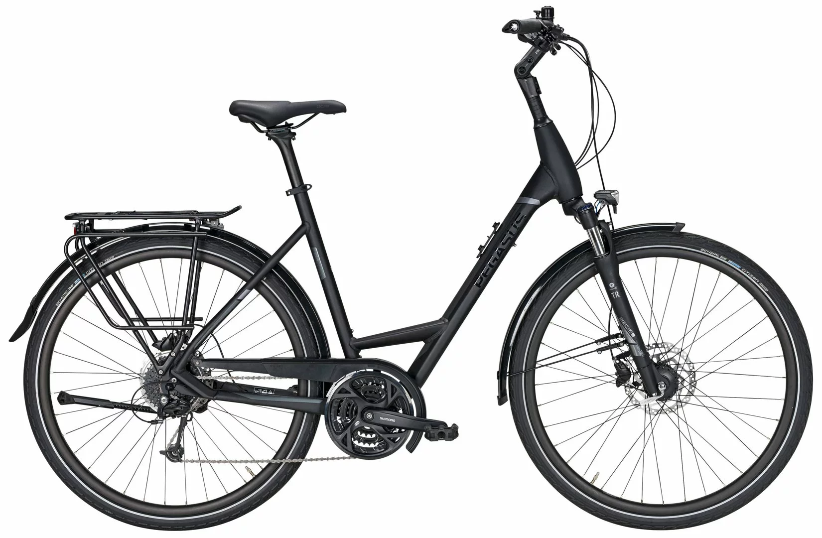 Hydroforming 6061 Alu-Rahmen, Suntour NEX-E25-HLO Federgabel, Alivio Schaltwerk mit Acera Umwerfer und Altus Schalthebeln und Tretlager, Shmiano MT201 Scheibenbremsen (180/180mm), Andra-25 Hohlkammerfelgen, Zecure Lenker, Vorbau (verstellbar), Sattel und Sattelstütze, Schwalbe Citizen Reifen (47-622), 50 Lux LED-Lampe, Standrücklicht, I-Rack-2 Gepäckträger