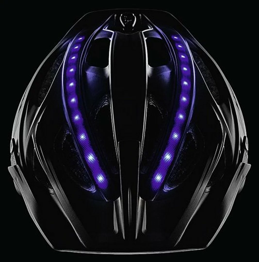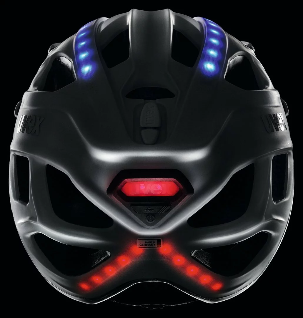 In ausgeschaltetem Zustand erscheint der UVEX City Light als schlichter, sportlicher City-Radhelm. Erst beim Druck auf den Power-Button zeigt er sein wahres Gesicht: Insgesamt vier unter der Außenschale liegende leuchtende LED-Bänder mit 32 LEDs zwei blaue vorne, zwei rote hinten machen den Radfahrer in der Dämmerung oder Dunkelheit gut sichtbar. Der Radfahrer kann dabei ganz einfach zwischen stehendem, blinkendem und fadendem Licht per Knopfdruck wechseln. Je nach Modus hält der integrierte Akku zwischen 6 und 12 Stunden. Innerhalb zwei Stunden kann er über das mitgelieferte USB-Kabel aufgeladen werden. Eine zusätzliche LED zeigt den Ladestatus: – Grün: 60% verbleibende Leistung – Grün-Rot: zwischen 30 und 60% verbleibende Leistung – Rot: verbleibende Leistung unter 30%